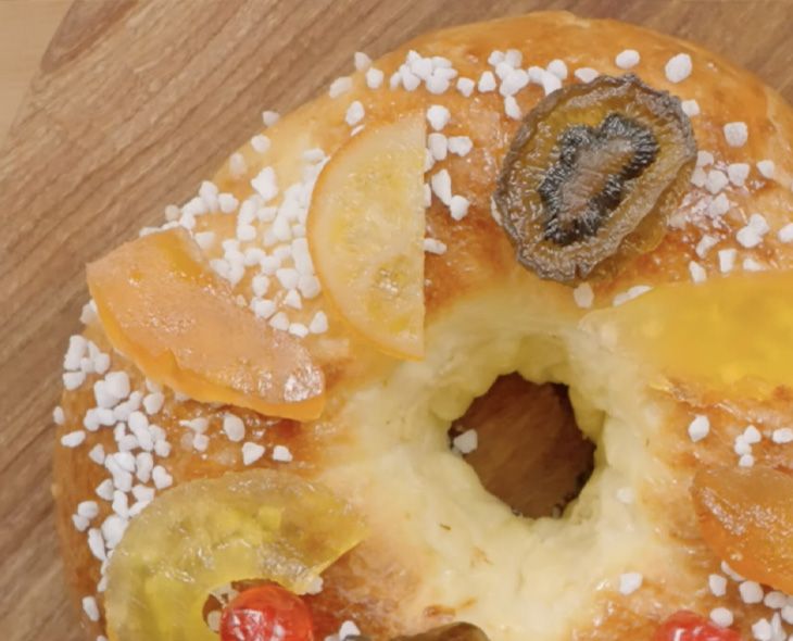Sortez la brioche du four, elle doit être bien dorée, et badigeonnez-la de sirop à l’aide d’un pinceau. Le sirop va coller en refroidissant, ajoutez à ce moment-là le sucre perle et les fruits confits.