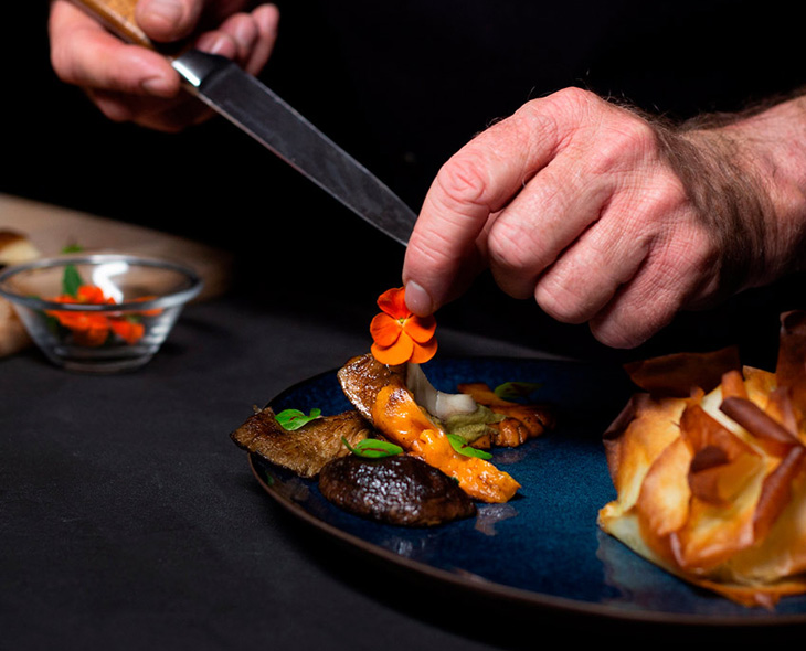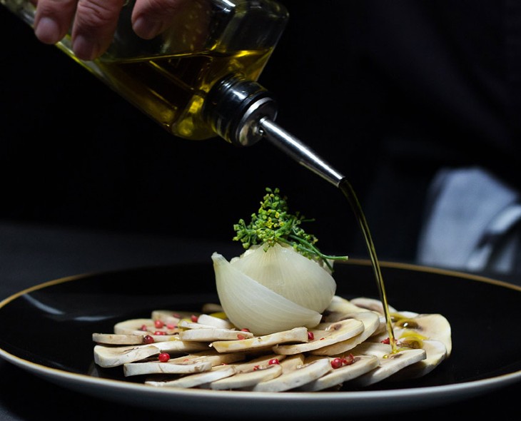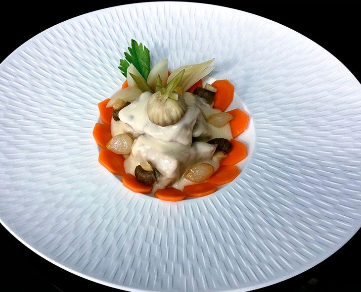 - Disposer les lamelles de champignons en rosace dans chaque assiette ( s’aider d’un cercle emporte pièce si nécessaire)