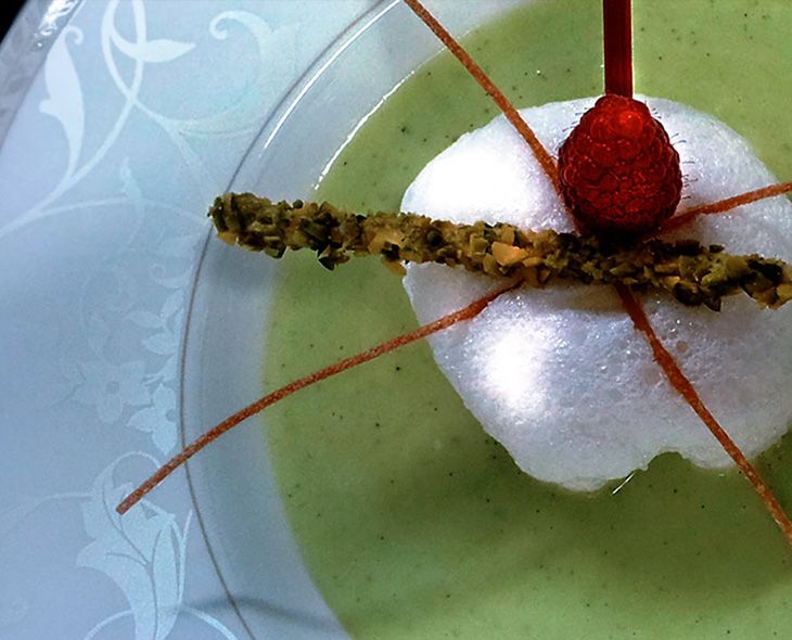 Dresser en assiette à soupe la sauce pistache. Dèposer la sphére de blanc meringuée. Insérer la pipette de coulis framboise. Ajouter une feuille de menthe et une framboise et déposer un mikado pistache