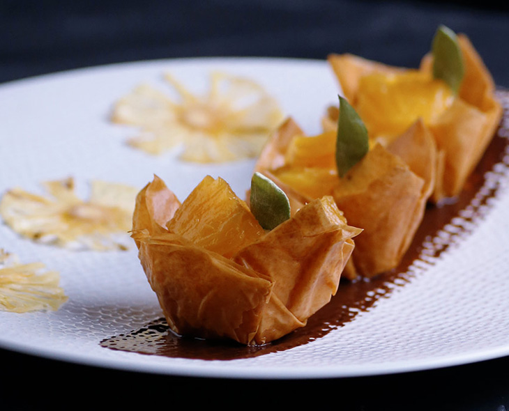Superposer 3 feuilles de pâte filo légèrement huilées et découper 12 carrés d’environ 5 cm de côté. Mouler ces carrés dans des empreintes en silicone afin de former les tulipes.